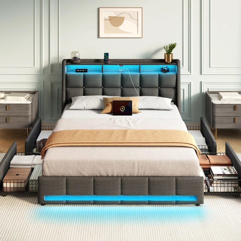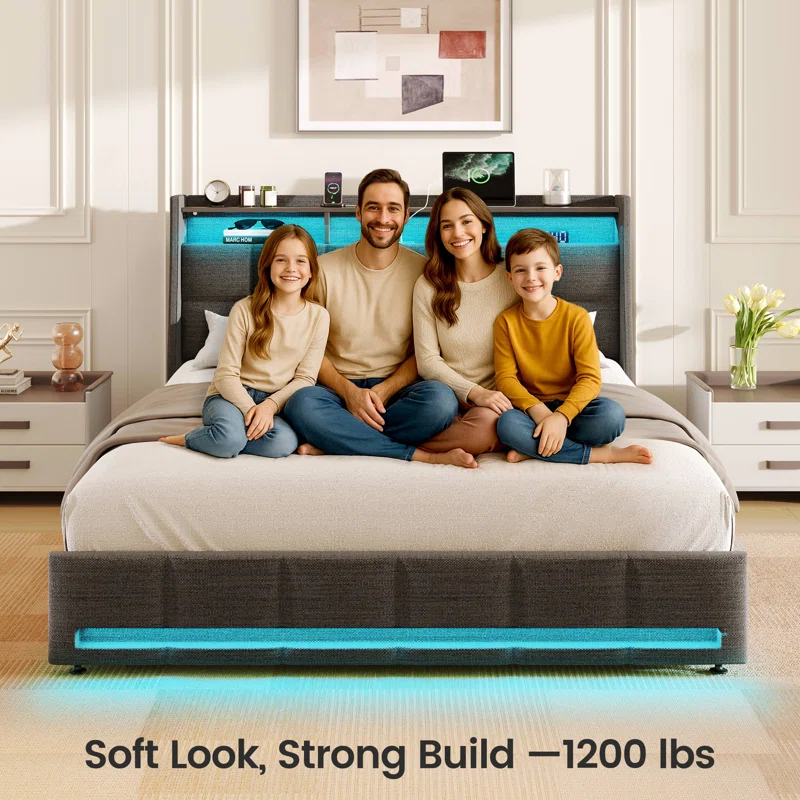 This upholstered platform bed frame features a distinctive wingback headboard and multifunctional dimmable design, showcasing modern style and greatly enhancing the room’s aesthetics. The soft backrest provides extra lateral support, ensuring comfort for your head, neck, back, and shoulders. The headboard includes two tiers of shelving for conveniently storing phones, books, headphones, and more, along with 2 USB ports and 1 Type-C port for easy charging of your phone and tablet. The bed frame supports LED lights on both the headboard and footboard, offering 60,000 color options and 3 dynamic modes to create a romantic nighttime atmosphere. This bed frame is an excellent choice for both its visual appeal and functionality.
